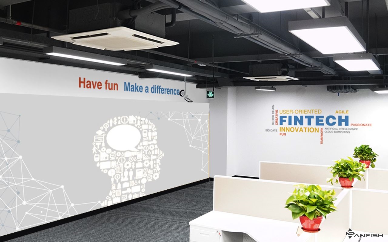 說實(shí)話,很多廣告公司迷之喜歡用的亞克力其實(shí)非常非常費(fèi)錢,舉個(gè)例子,下面是我們給招商銀行客服總部場(chǎng)地做的其中兩個(gè)墻面: